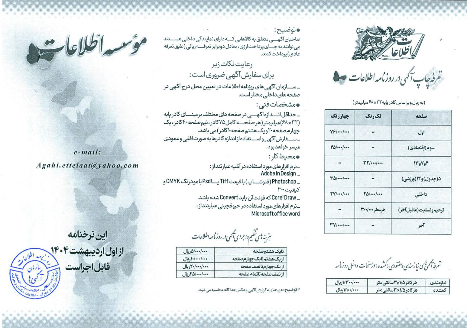 تعرفه آگهی روزنامه اطلاعات سال ۱۴۰۴