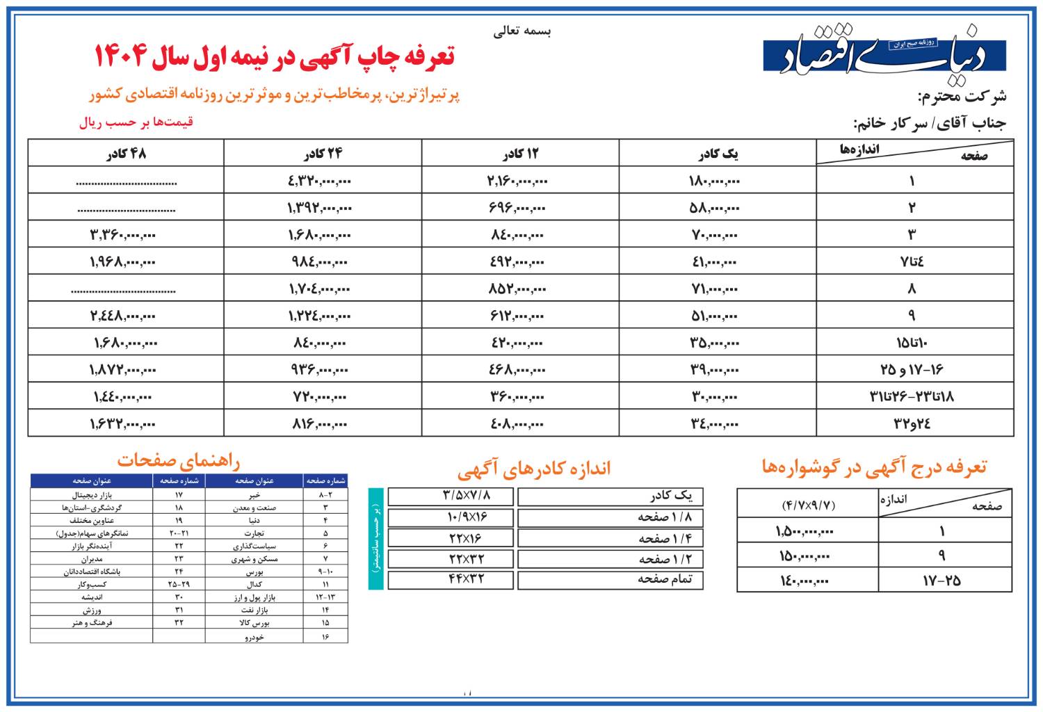 تعرفه آگهی روزنامه دنیای اقتصاد سال ۱۴۰۴