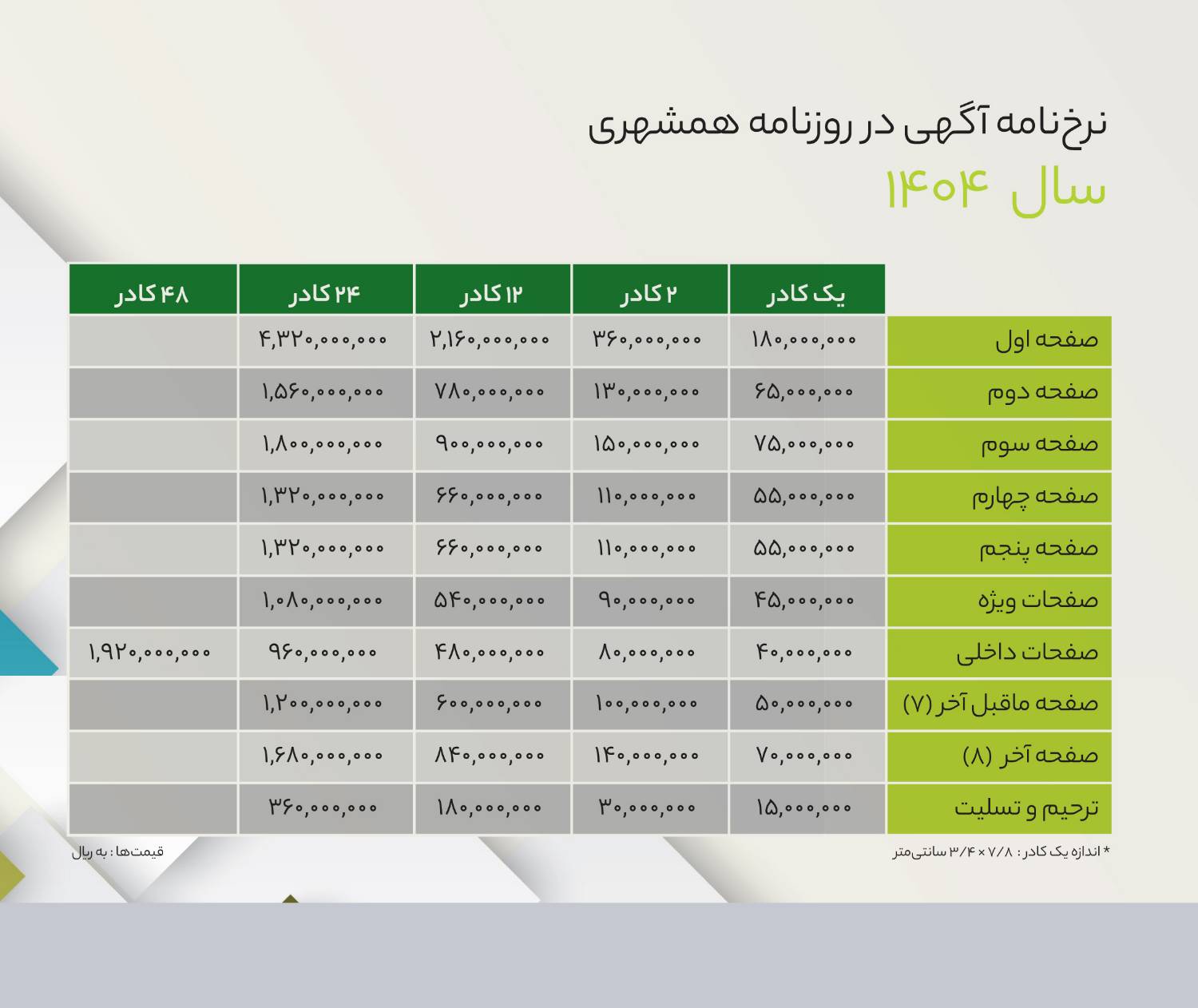 تعرفه آگهی روزنامه همشهری سال ۱۴۰۴